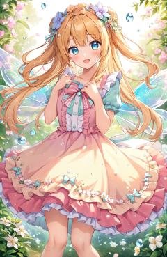 "Cute anime art style, a young fairy with glittering wings flutters above a magical garden filled with oversized flowers and sparkling dew drops. She wears a short, frilly dress with matching floral accessories, and her expression is one of pure joy. The garden is bathed in a soft pastel light, creating a whimsical and enchanting atmosphere."