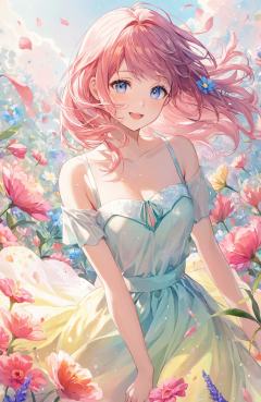 A young girl in a flowing pastel dress, surrounded by vibrant flowers that seem to burst into existence from the canvas. The scene is painted in soft, watercolor splashes, blending the girl's gentle expression with the wild beauty of nature. The colors are bright and uplifting, creating a sense of joy and lightness