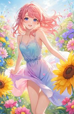 A young girl in a flowing pastel dress, surrounded by vibrant flowers that seem to burst into existence from the canvas. The scene is painted in soft, watercolor splashes, blending the girl's gentle expression with the wild beauty of nature. The colors are bright and uplifting, creating a sense of joy and lightness.