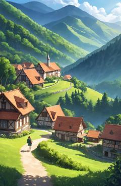 "Wanderlust, a girl with a backpack exploring a serene, sunlit mountain village, vibrant green forests, and quaint cottages in the distance."