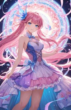 A playful scene where a girl with pink and blue hair stands surrounded by swirling ribbons of light. Her attire is a blend of modern and fantasy elements, with intricate details that make her look both fierce and magical. The background is a blend of soft pastels and vibrant hues, creating a dreamlike atmosphere.