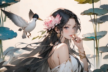 masterpiece,(masterpiece, top quality, best quality),1girl, long hair, bird, flower, black hair, lotus, solo, hair ornament, dress, bare shoulders, very long hair, upper body