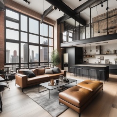 A spacious industrial loft apartment, large open living area with exposed brick walls and high ceilings, vintage leather sofa and modern art pieces, large kitchen with stainless steel appliances, wide windows with city skyline views, moody lighting, stylish and eclectic, hd quality, urban and chic, raw yet polished design