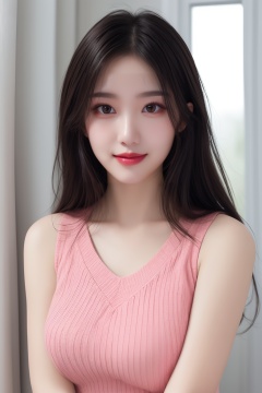 1girl, black hair, breasts, brown eyes, curtains, indoors, lips, lipstick, long hair, looking at viewer, makeup, pink sweater, sleeveless, smile, solo, sweater, upper body <lora:肉嘟嘟:0.8>