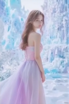 The background is a fantastical landscape composed of crystalline structures in pastel shades of blue, purple, and pink, resembling a dreamy, otherworldly ice cave. The crystals are intricately detailed, adding a sense of enchantment to the scene. The overall atmosphere is serene and ethereal, with soft lighting enhancing the dreamlike quality of the artwork. The young woman's delicate features and the surreal, crystalline environment create a harmonious and mesmerizing visual composition., ,eluosi