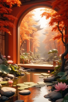 Futurism,Eastern aesthetics,Surrealism,Song Dynasty architecture,splendid architecture,bright lighting,abundant light,A type of Chinese garden architecture with orange walls and roofs,a large window overlooking autumn trees outside,a beautiful indoor garden with rockery landscapes,lotus leaf water features,and a small wooden bridge spanning clear water surfaces. This scene exudes tranquility and warmth,bathed in warm golden sunlight,passing through autumn leaves,with warm tones,facing,symmetrical composition,high resolution,and ultra detailed,