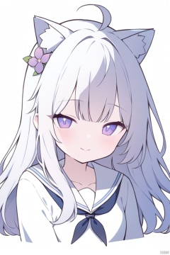 chibi,cleavage, (cat ears), half-closed eyes , school uniform, 1girl, solo, looking at viewer, flower, long hair, bangs, closed mouth, simple background, white background, upper body, white hair, hair intakes, purple eyes, expressionless, eyelashes, best quality, smile, White cat ears