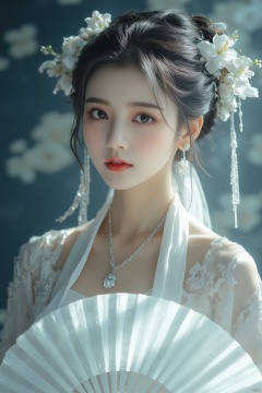 A close-up shot of a Asian woman in a white chinese clothes with a silver necklace and earrings.She is holding a white fan. The woman's hair is adorned with white flowers adding a touch of beauty to the scene. The background is blurred creating a soft focus on the woman's face.neon lighting,