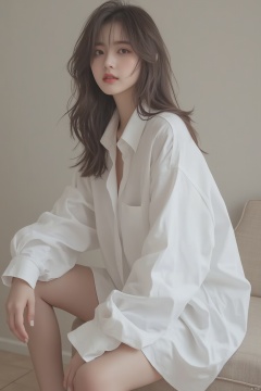 1girl is wearing a white boyfriend shirt,Shoulders and legs exposed,sitting,