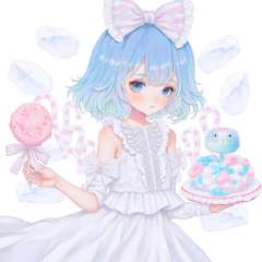 illustration in yogisya style, 1girl, solo, candy, blue hair, food, blue eyes, wings, ice, bow, hair bow, short hair, dress, candy cane, <lora:yogisya:1>