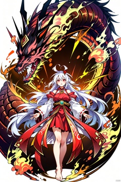 1girl solo long hair looking at viewer red eyes jewelry ahoge white hair japanese clothes horns barefoot bare legs fire dragon flame blue fire