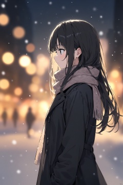 (masterpiece),(best quality),(masterpiece),(best quality),1girl, black_coat, black_hair, blurry, blurry_background, blurry_foreground, bokeh, city_lights, coat, depth_of_field, from_side, jacket, lens_flare, long_hair, long_sleeves, looking_away, motion_blur, outdoors, scarf, snow, snowing, solo, upper_body
