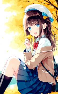 (masterpiece),(best quality),illustration,ultra detailed,hdr,Depth of field,(colorful),Artist hiten (hitenkei),1girl,solo,skirt,outdoors,long hair,shirt,jacket,brown hair,looking at viewer,bag,sitting,socks,hat,pleated skirt,holding,bow,smile,tree,open mouth,white shirt,school uniform,blue skirt,school bag,black socks,bowtie,autumn,leaf,long sleeves,beret,hair ornament,holding leaf,red bow,collared shirt,kneehighs,open clothes,off shoulder,day,autumn leaves,white headwear,open jacket,blazer,:d,blue eyes,brown jacket,red bowtie,ginkgo leaf,knees up,one side up,water,from side,hand up,dress shirt,bag charm,charm (object),