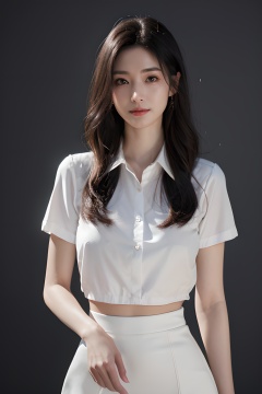 <lora:0827_01:0.7>simple background, (global illumination,  reality, ray tracing,  HDR,  unreal rendering,  reasonable design,  high detail,  masterpiece, best quality,  ultra high definition,  movie lighting),1girl,solo,smile,realistic,looking at viewer,long hair,makeup,upper body,<lora:z_Cloth_SenLuo_office lady_1_KEEPCHAR_1_DEFACE:0.55>,upper body,office lady,white shirt,black skirt,pencil skirt,pantyhose,white skin,pale skin,cinematic_lighting,frontlight,Volumetric  Lighting,(EOS R8,50mm,F1.2,8K,RAW photo,,, 1girl,realistic,masterpiece, best quality, photorealistic, HDR,detail