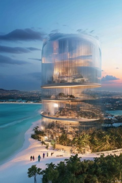 At dusk, a future coastal city shows its unique charm under the skyline, its design cleverly fusing the harmony between modern civilization and nature. The floating buildings are a dream-like spectacle, and the glass curtain walls are like giant color palettes, reflecting the sunset clouds in the sky like a picturesque scene. Leisurely people strolled along the long white sand beach, enjoying the breeze of the sea. This tropical paradise, with its turquoise seas, lush vegetation and pristine white sand, and a high-tech eco-residential area powered by sustainable energy, shows respect for and protection of the environment.
