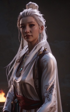score_9, score_8_up, score_7_up, 8k, best quality, masterpiece, (ultra-detailed), solo, looking at viewer, <lora:heishenhua-pony-Tanger-000010:0.8>, tieshan,1girl,white dress,white hair,long hair,loose hair , jewelry, necklace, , by heishenhua, game cg,