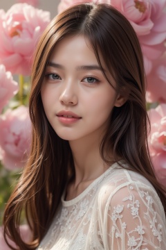 Closeup portrait of a beautiful girl with long flowing hair, surrounded by paradisiacal pink peonies with transparent petals, glowing in the background. Dreamlike and ethereal atmosphere, soft lighting and intricate details. Art inspired by John Singer Sargent's portraits and Claude Monet's use of light in his paintings. (Realistic oil painting style)
