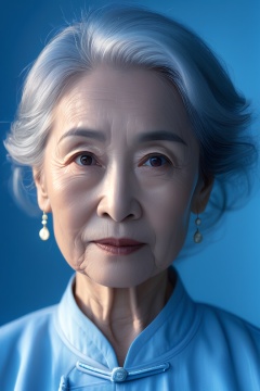A close-up, hyper-realistic portrait of an elderly woman with silver hair and soft wrinkles, eyes filled with wisdom, bathed in soft, diffused light. Background is a simple, muted blue gradient, making her features stand out. Ultra HD, realistic textures, Nikon Z9, fine detail, soft focus, natural beauty