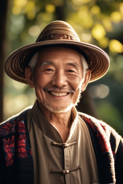 realistic portrait of an elderly man with a kind smile, wearing a traditional hat, captured in soft daylight. The background is an outdoor scene, slightly blurred, with warm sunlight filtering through trees. Canon EOS R6, ultra-high detail, natural colors, fine textures, depth of field