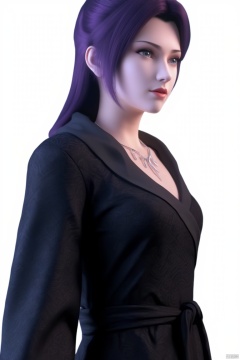 (masterpiece, best quality:1.4),finely detailed,YunYun, Black Robe,1girl, solo, long hair, breasts, looking at viewer, simple background, white background, jewelry, upper body, purple hair, necklace, lips, realistic