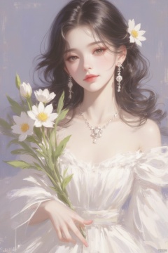 1girl, solo, looking at viewer, black hair, hair ornament, dress, holding, bare shoulders, jewelry, full body, flower, earrings, parted lips, hair flower, necklace, off shoulder, white dress, mole, lips, mole under eye, bouquet,