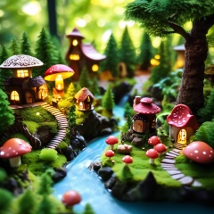 A miniature forest world, with tiny trees, a small river, and a hidden village made of mushroom houses. Lush, vibrant greens dominate the scene. Soft lighting filtering through the trees. Background with blurred depth, creating a sense of scale. Details include tiny animals, hand-carved textures, and natural materials.