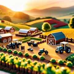 A bustling miniature farm world, with tiny barns, livestock, and crops in neat rows. Earthy, warm tones with golden sunlight. Background with rolling hills and a distant barn, creating a sense of depth. Details include tiny tractors, detailed fences, and textured crop fields.