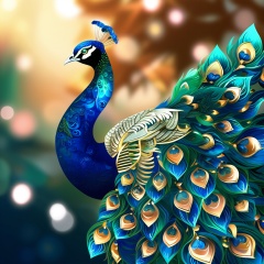 An elegant origami peacock, showcasing its elaborate feathers with intricate folding patterns. Brilliant blues and greens with iridescent highlights. Background with a soft bokeh effect to focus on the peacock. Fine lines and sharp edges, natural shading, and graceful composition.