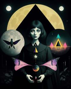 a colorful moth witch with moths around her,Arabella Rankin, otherworldly, an album cover, aestheticism, moon and triangle background, Christian W. Staudinger, surreal photography
