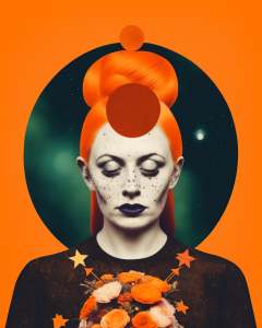 Irish mystic woman with freckles and horns and flowers in her orange hair is wearing a shiny outfit, Arabella Rankin, otherworldly, an album cover, aestheticism, colorful circle and moon and stars background