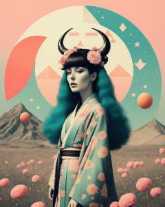 (african woman) wearing a kimono and big horns and flowers in her turquoise hair in the middle of a field of candy, Arabella Rankin, otherworldly, an album cover, aestheticism, colorful triangles and moon and stars background