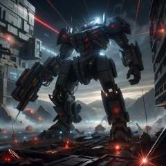<lora:LaserTech:0.8> , scifi , lasertech , military grade,red lasers,   third person view, at rooftop, looking at huge colossal battle mech , destruction,