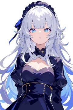 1girl, bangs, black_dress, blue_eyes, breasts, dress, grey_hair, hair_ornament, juliet_sleeves, long_hair, long_sleeves, looking_at_viewer, medium_breasts, parted_lips, puffy_short_sleeves, puffy_sleeves, simple_background, solo, upper_body, white_background