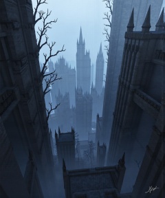 <lora:flux-shock-scenery:1>,The image is an aerial view of a city with tall buildings and trees. The buildings are made of stone and have intricate architectural details. The trees are twisted and gnarled, creating a canopy over the city. The sky is a pale blue, and the overall mood of the image is eerie and mysterious. The image appears to be taken from a high vantage point, looking down on the city below.