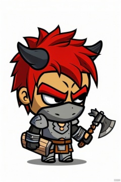 solo, 1boy, weapon, male focus, red hair, horns, chibi, armor, mask, facial hair, axe, mohawk