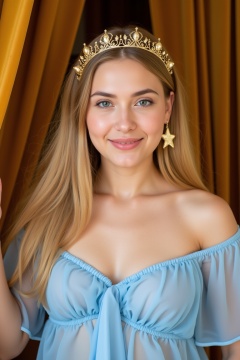 detailed skin pore style, photograph featuring an attractive young woman with long, flowing blonde hair, adorned with a delicate golden crown, exuding a fairy tale charm. She wears elegant gold star-shaped earrings that catch the light beautifully. Her dress is a soft, ethereal blue with sheer elements, adding a dreamy quality to the scene. The background features luxurious drapery in warm, muted tones that contrast with the cool blue of her attire. Soft, natural lighting illuminates her radiant skin, highlighting her gentle smile and captivating eyes.