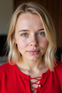 RAW photo, a candid full body portrait of a beautiful blonde woman wearing a (red shirt), 8k uhd, dslr, soft lighting, high quality, film grain, Fujifilm XT3