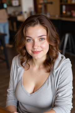 a 20 year old woman wearing  hoodie ,round breast, cleavage. Pale skin, freckles, wavy brown hair, blue eyes, beautiful eyelashes, Looking up at the viewer, photo taken from above. She is sitting at a table in a busy coffee shop.she has a subtle flirtatious smile