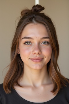senior year school photo, front view, portrait photo of a 18 y.o girl, brown hair, half updo, beautiful face, cinematic shot