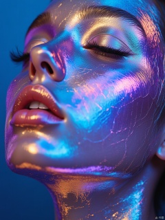 OBlvbo,This image is a highly stylized, digital artwork featuring a close-up of a person's face. The subject has their eyes closed, lips slightly parted, and their face is covered in a mesmerizing array of metallic, reflective surfaces. The textures are smooth and glossy, with intricate patterns and cracks that create a sense of depth and movement. The colors are vibrant and dynamic, with shades of blue, purple, and pink dominating the scene. The metallic surfaces catch the light, creating a rainbow-like effect with hues of gold and silver, adding to the surreal and otherworldly quality of the image. The background is a gradient of deep blue and purple, enhancing the overall ethereal feel. The person's skin appears almost liquid, with the metallic surfaces blending seamlessly into the contours of their face, creating a striking and futuristic aesthetic. The overall composition and use of light and color evoke a sense of beauty and mystery, making the image both visually captivating and thought-provoking.