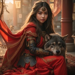 (A red and gold image of a young girl as a warrior woman, dressed in fine armor, with a large gray wolf next to her with it's head nestled on the girl's lap, in the background of an oriental-style scene), masterpiece, HDR, depth of field, wide view, bright background, raytraced, full length body, unreal, mystical, luminous, surreal, high resolution, sharp details, with a dreamy glow, translucent, beautiful, stunning, a mythical being exuding energy, textures, breathtaking beauty, pure perfection, with a divine presence, unforgettable, and impressive.