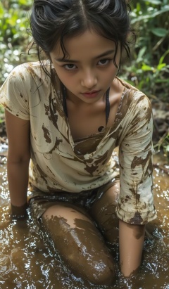 1girl, shirt, dirty water, sitting