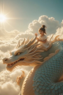A whimsical scene unfolds above a wispy cloud layer. A petite girl, no more than five years old, sits perched atop the majestic back of a Chinese dragon. The enormous serpentine body stretches out in all directions, its scales glistening in warm sunlight that filters through the clouds. The little girl's tiny hands grasp the dragon's scaly neck as she gazes up at the viewer with wide eyes, her pigtails blowing gently in the breeze.,loong,young girl,Felt style