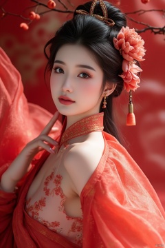 Against a vibrant, high-contrast background, a breathtaking Chinese beauty in flowing hanfu dress commands attention. Shot with 35mm f/2.0 lens, her regal presence fills the frame. Piercing black eyes gaze directly at the viewer, subtle eye makeup and defined eyebrows adding depth. Raven tresses cascade down her back, adorned with delicate hair ornament and elegant bun, peony resting atop, symbolizing prosperity. FLUX title dominates bottom of frame in bold letters, amidst busy, dynamic layout reflecting modern life's fast pace.