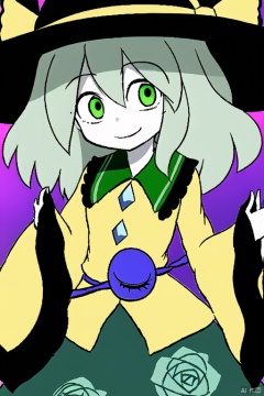 ,simple background,white skin,komeiji koishi,1girl, hat,hat bow,green hair,green eyes,yellow shirt,green skirt,,long sleeves, wide sleeves, floral print,third eye,eyeball,cute,smile
