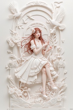 1girl, solo, long hair, brown hair, hair ornament, dress, jewelry, sitting, full body, flower, high heels, bird, crossed legs, staff, pillar, throne, dove
