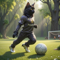 A whimsical scene unfolds as a sleek black cat dons a miniature soccer jersey and cleats, its eyes gleaming with mischief. The camera captures a tight shot of the feline's paws expertly controlling the ball on a lush green grassy field, sunlight casting long shadows behind the goalpost. The cat's agile body is frozen in mid-stride, as if poised to make a swift move around an opponent.