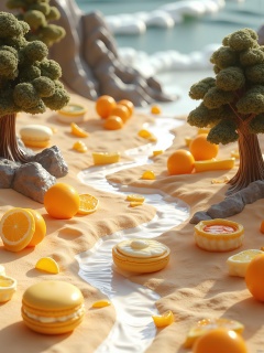 OBweisuo,This is a highly detailed, realistic CGI (computer-generated imagery) photograph depicting a surreal, whimsical beach scene. The setting features a sandy beach with a winding, shallow stream running through the center. The stream is lined with various types of confections, including macarons, tarts, and candied fruits, all in shades of orange and yellow, which mimic the colors of the beach sand and the surrounding foliage. The scene is populated with miniature trees with lush, dark green foliage and snow-like, white icing, giving the impression of a frosty environment.In the foreground, there is a macaron with white cream filling, placed on a white, textured surface. Nearby, there is a tart with a dollop of white cream on top, and scattered around are candied oranges and lemons, some of which are sliced open to reveal their juicy interiors. The background features a rocky coastline with waves crashing against it, creating a dynamic contrast with the serene beach scene. The entire image is rich in texture and color, with a high level of detail that captures the viewer's attention and imagination. The style is reminiscent of a dreamy, fantastical landscape, blending elements of nature and confectionery in a harmonious, visually striking composition.