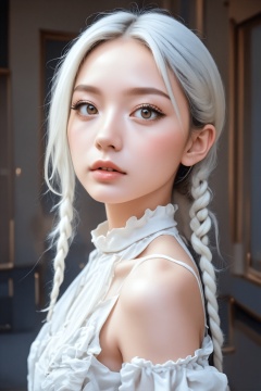 best quality, masterpiece,white hair, gold eyes,white clothes, looking up, upper body,hair strand,Fair skin,side braids