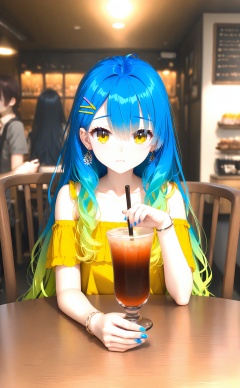 (masterpiece),(best quality),illustration,ultra detailed,hdr,Depth of field,(colorful),(chromatic aberration),Yuzu-Soft Style,hair ornament,cafe,shirt,sitting,long hair,blue nails,drinking straw,closed mouth,yellow eyes,off-shoulder shirt,solo focus,multiple girls,jewelry,holding,indoors,eyelashes,blue hair,collarbone,nail polish,cup,earrings,hairclip,casual,off shoulder,blurry,hair between eyes,straight-on,table,braid,blurry background,looking at viewer,bare shoulders,holding cup,eyes visible through hair,gradient hair,black shirt,frilled shirt,restaurant,frills,multicolored hair,3girls,yellow shirt,fingernails,bracelet,chair,very long hair,drinking glass,frown,1boy,short sleeves,drink,food,sidelocks,wavy hair,plant,